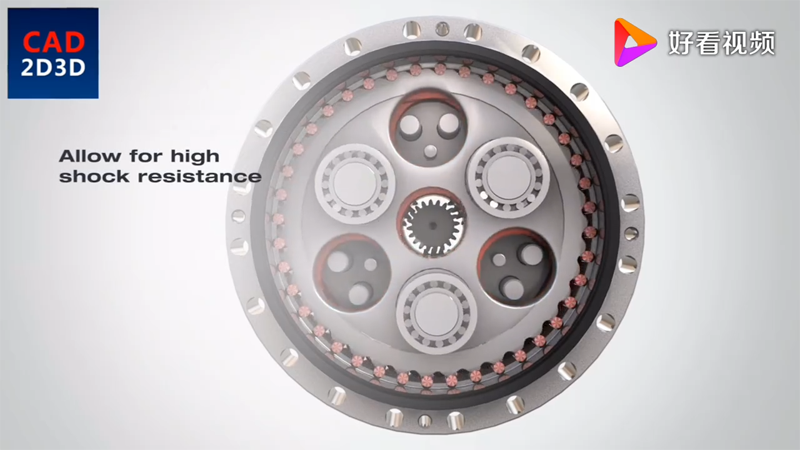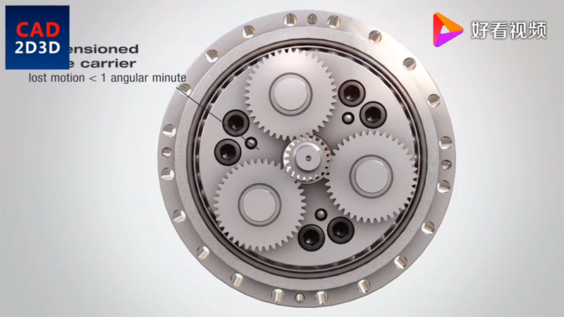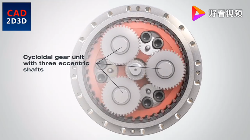 3個(gè)行星齒輪,同輸入齒輪驅(qū)動,行星齒輪帶動曲柄軸旋轉(zhuǎn),曲柄帶動RV齒輪朝相反方向旋轉(zhuǎn)。