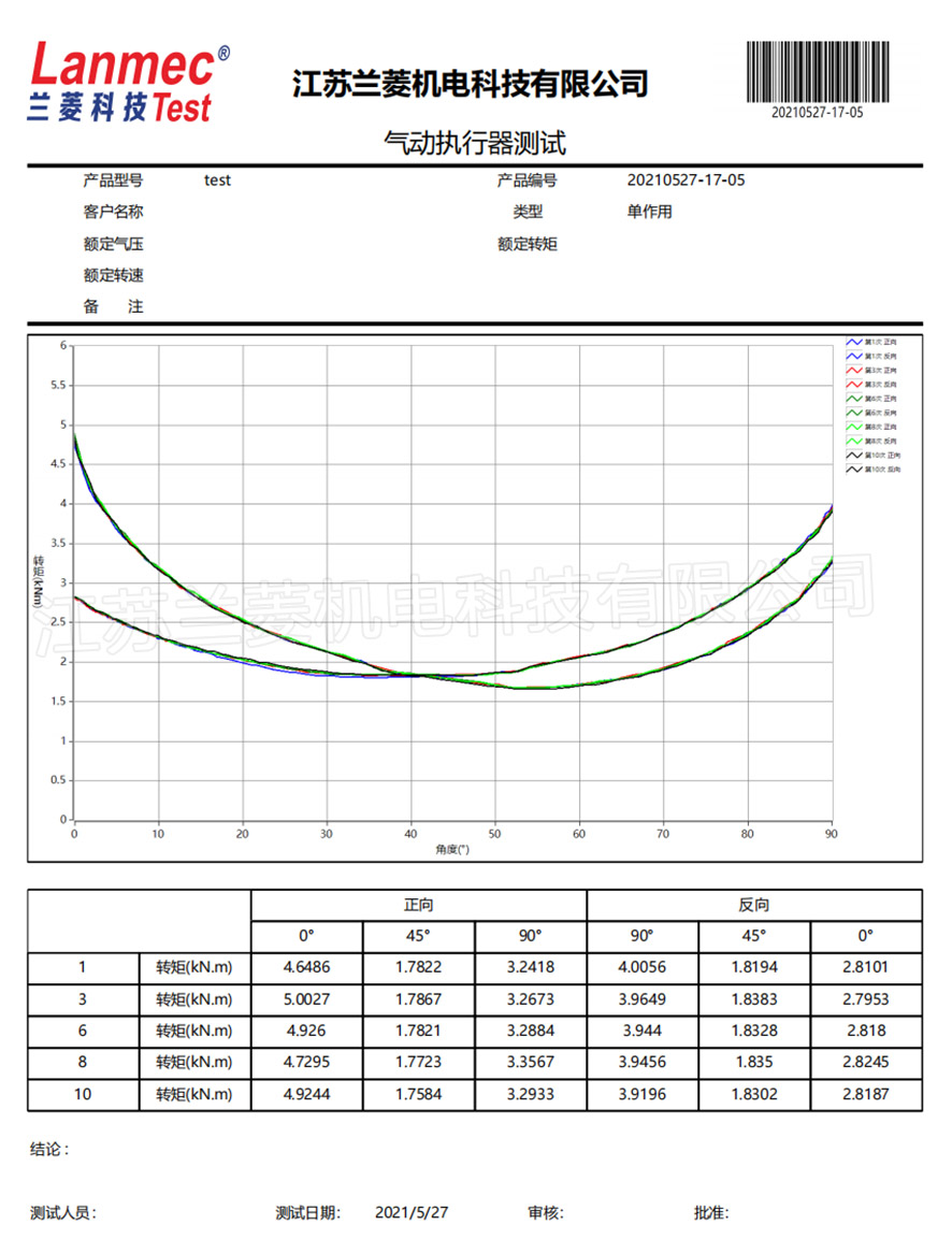 蘭菱科技為蘇州紐威閥門有限公司定制的30000N.m撥叉式氣動執(zhí)行器測試臺,調(diào)試完成,得到客戶的肯定! 設(shè)備功能:1、各角度最大扭矩測試,自動調(diào)節(jié)氣壓(0~1MPa)、充放氣,自動控制油缸行程、控制角度,自動測量并記錄角度、氣壓、最大扭矩,并形成曲線和報表;2、壽命測試,客戶可以自定義加載扭矩、運行次數(shù),數(shù)據(jù)異常自動停機,并顯示故障內(nèi)容,考驗撥叉式氣動執(zhí)行器的質(zhì)量及使用壽命。